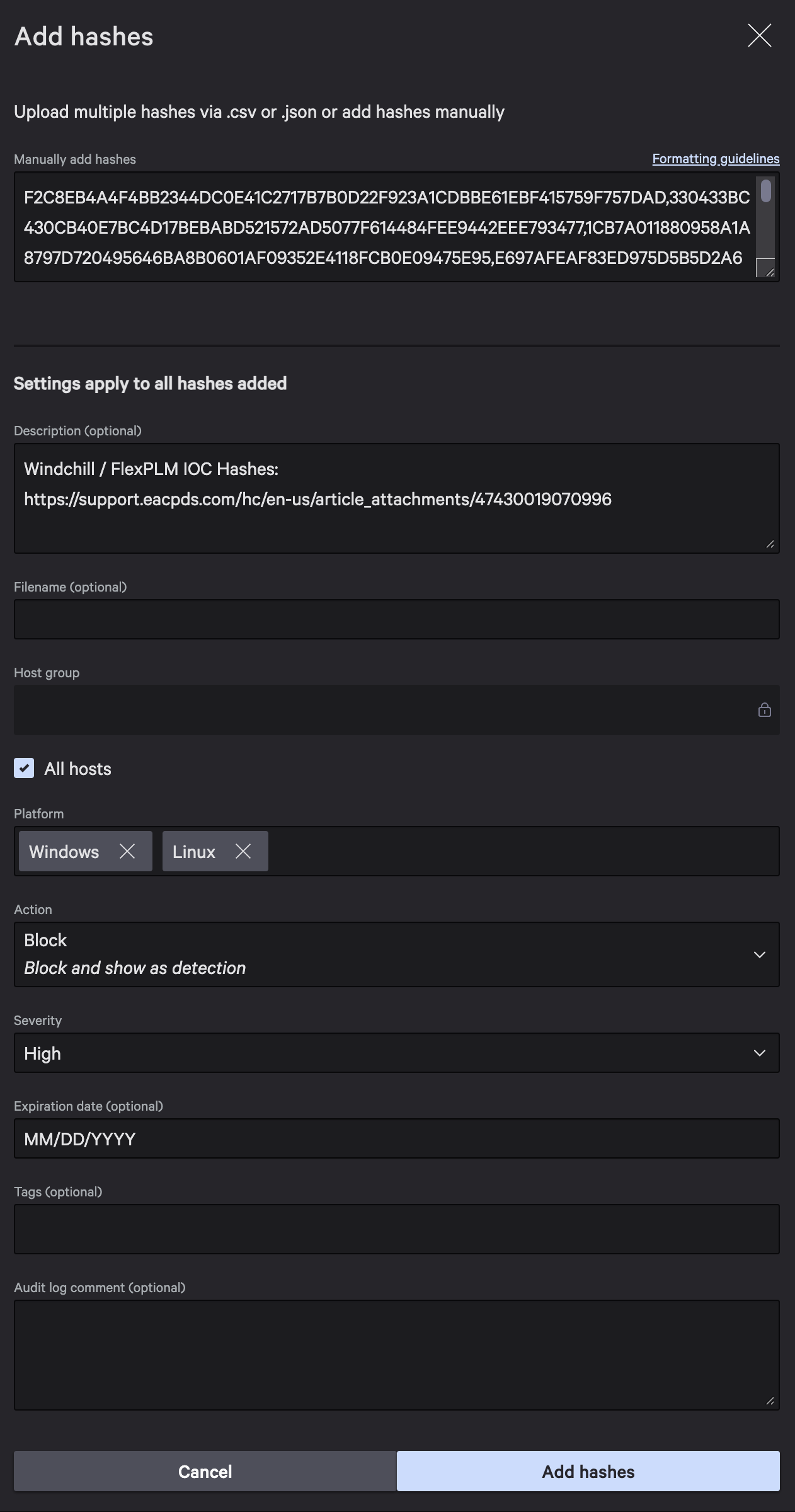 F2C8EB4A4F4BB2344DC0E41C2717B7B0D22F923A1CDBBE61EBF415759F757DAD,330433BC430CB40E7BC4D17BEBABD521572AD5077F614484FEE9442EEE793477,1CB7A011880958A1A8797D720495646BA8B0601AF09352E4118FCB0E09475E95,E697AFEAF83ED975D5B5D2A6604F08E7496D99F9775F33407B0B02530516D88D,AFEDA8E680639FE58343AE7A67B92C36E44A67A6BB7DC3C1FC239DF29CF225E0,AD388F887F2EB0114AA672EC0D9EE9201916F257EB982C96EC4867727C52082C,305241D4D27B07CFDD566AA16B22CF79116EE9BC254D6D8A8032443ABA2EC985,69E41E4B68A1097143C394DE25B2E1D33A819AED0C61F3DF891485A98B5AAA07,78473ABBECDFF2BDC30BCB96B0B3EAC3BD6493E6960D11D03277509EFDA188F2Als "Platform" sollte Windows und Linux ausgewählt werden. Die "Action" und "Severity" sollte nach eigenem Ermessen gesetzt werden, alternativ zum Block wäre auch "Detect Only" möglich.